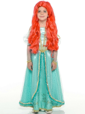 В комплект карнавального костюма Принцесса Ариэль входит платье для девочек бирюзового оттенка. Оно украшено золотыми нитями, пайетками и стразами. Снизу юбки вышит интересный узор. На голову надевается парик с красивыми длинными рыжими волосами. Без атрибутов морской жизни не обойтись. Верх платья украшен брошью в форме ракушки, а в волосах переливается заколка в виде морской звезды. Эта модель маскарадного костюма для девочек является более бюджетным вариантом, т. к. он выполнен из текстильного материала. Покупайте оптом и розницу карнавальный наряд из диснеевского мультфильма в магазине детских костюмов «Хлопушка».
