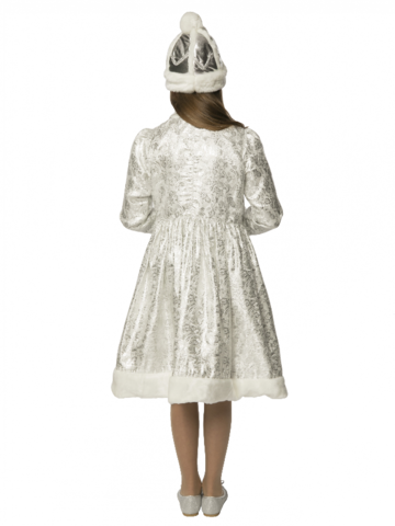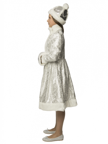 Костюм Снегурочки состоит из шубки, выполненной из серебряной парчи и посаженной на подкладку их хлопчатобумажной ткани. Отрезная по талии шубка оторочена искусственным мехом. Застегивается шубка на шубные крючки. Красивая муфточка вешается на шею на серебряный шнурок. Удобная шапочка отлично дополняет костюм Снегурочка.