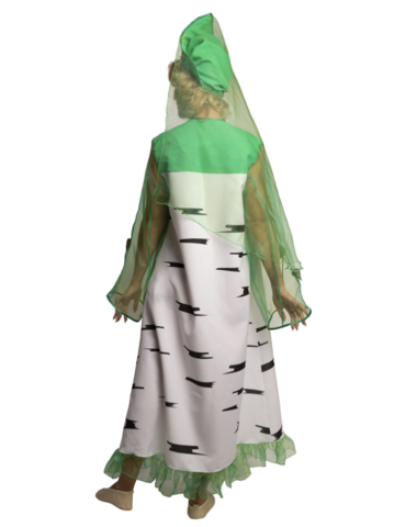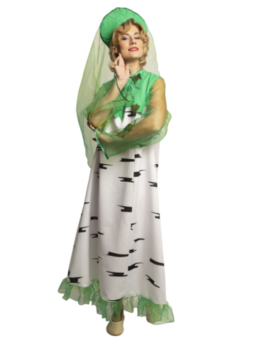 В состав карнавального костюма Березка входит длинное платье и роскошный кокошник с фатой. Платье выполнено из атласа с характерным рисунком, украшено оборками и широкими рукавами из органзы. Высокий кокошник удобно фиксируется на голове, а фата из органзы красиво колышится при движении.