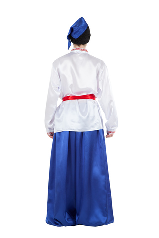 Карнавальный костюм взрослый мужской национальной тематики украинский. В костюм входят рубаха, шаровары, пояс, шапка. Белая рубаха с разрезом на груди декорирована красной и узорчатой тесьмой в национальном стиле. Синие шаровары с красным поясом выполнены из атласной ткани с мягким блеском. Головной убор сшит из атласной синей ткани и искусственного меха. Яркий и колоритный костюм подойдет для танцевального или вокального выступления, театрализованной постановки.