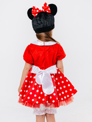 Костюм Минни Маус для детей - яркий образ для самых разных праздников. В комплект входит красное платье, белые панталоны и шапка-маска. Универсальный размер для девочек от 3 до 5 лет.