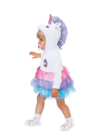 Костюм Единорога для самых маленьких станет отличным приобретением для фотосессии или первой новогодней елки малыша. Карнавальный костюм на девочку от 6 месяцев до 1 года смотрится необычайно мило и сказочно. Костюм Единорожка для девочек – это белый комбинезон-боди с пришитой разноцветной юбкой.