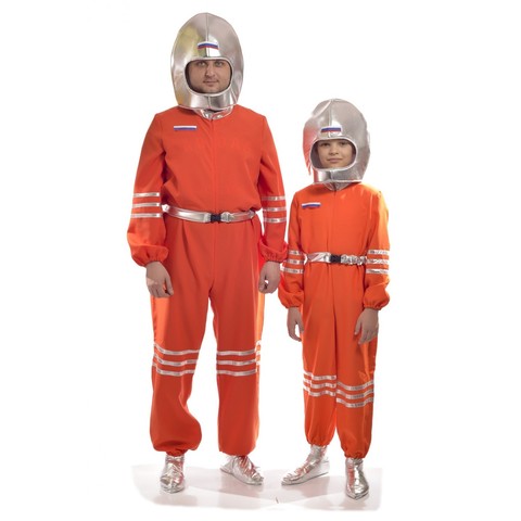 Оранжевый костюм космонавта СССР - идеальный образ для дня Космонавтики. В комплект входит оранжевый комбинезон со светоотражающими полосками, блестящий пояс и серебряный блестящий шлем.