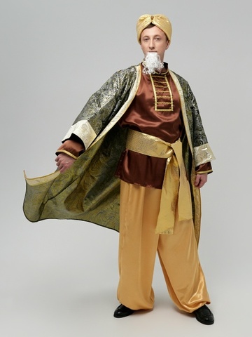 В комплект входит: рубашка, шаровары, пояс, чалма, халат, бородка.