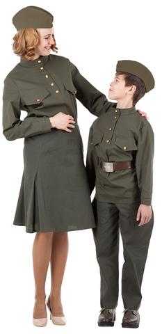 Военно-патриотическая форма создана специально для тематических мероприятий, приуроченных ко Дню Великой Победы. Военный костюм для девушек выполнен из натуральной ткани – бязь (100% хлопка) – и состоит из гимнастерки, юбки и пилотки, ремня с пряжкой. Рекомендуем дополнить образ имитацией военных сапог (продаются отдельно), которые можно надеть поверх легкой обуви. Из данного комплекта также можно создать образ военной медсестры, дополнив костюм сумкой, повязкой на руку и косынкой с красным крестом.