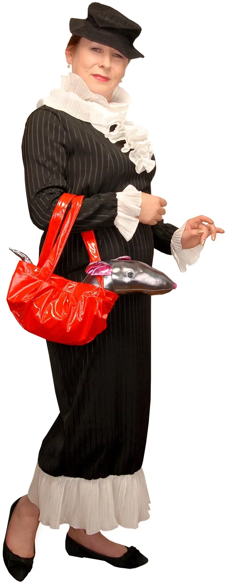 Комплект платье, шляпка с имитацией парика, сумка.