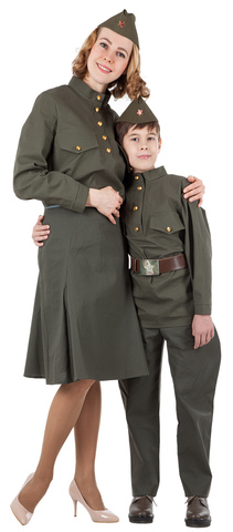 Военная форма Солдат подростковый. Гимнастерка из бязи (100% хлопок), пилотка из бязи со звездой, ремень из кожзаменителя с металлической звездой, юбка из бязи. Производство Россия. Размер: 34-36 на рост 134-140, 36-38 на рост 146-152, 40-42 на рост 158-164.